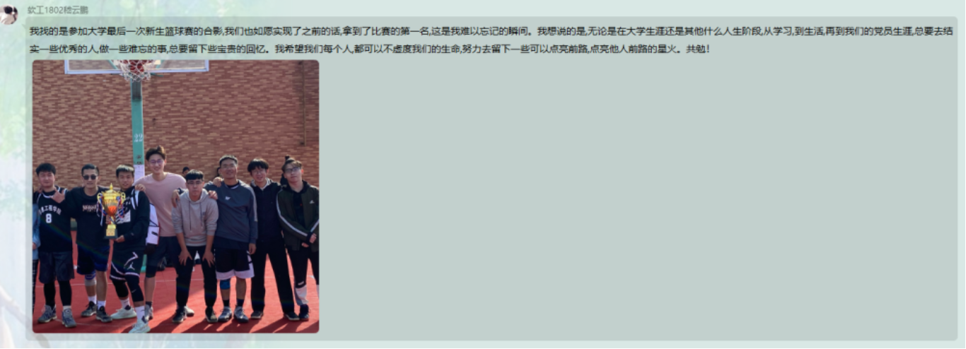 董晓辉同志表示,“白日不到处,青春恰自来。苔花如米小,也学牡丹开。苔花那么微不足道,却依然顽强地生长着。而我们作为一名大学生,更应当自立自强,积极向上。相信到了现在,我们大多数人都对自己的未来都有了清晰的认识和规划,都确定了自己的目标。希望大家都能坚定自己的目标,像苔花一样自立自强,为实现自己的目标和理想而努力奋斗!”