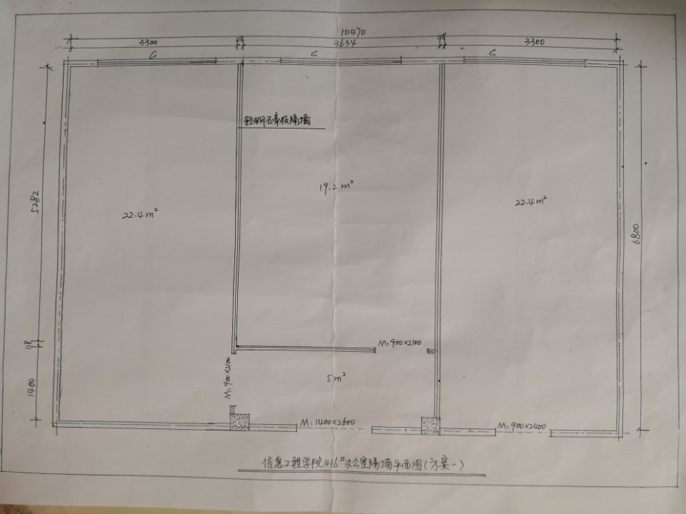 2.工程规模:410、416办公室进行隔墙立门改造,416办公室塑胶地面铲除和木地板铺装;