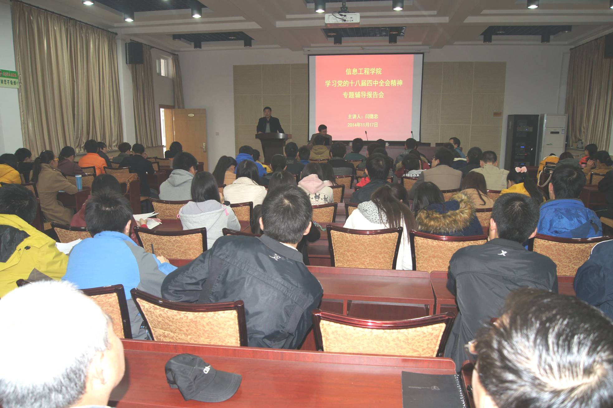 11月17日,91成人 举办学习党的十八届四中全会精神报告会,邀请校党委宣传部副部长闫德忠同志做辅导报告。91成人 领导、部分教师和学生党员150余人参加了报告会。报告会由91成人 党委副书记何卫军同志主持。