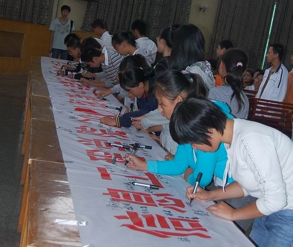 2008级新生争当优秀大学生签名活动”横幅上签名。
