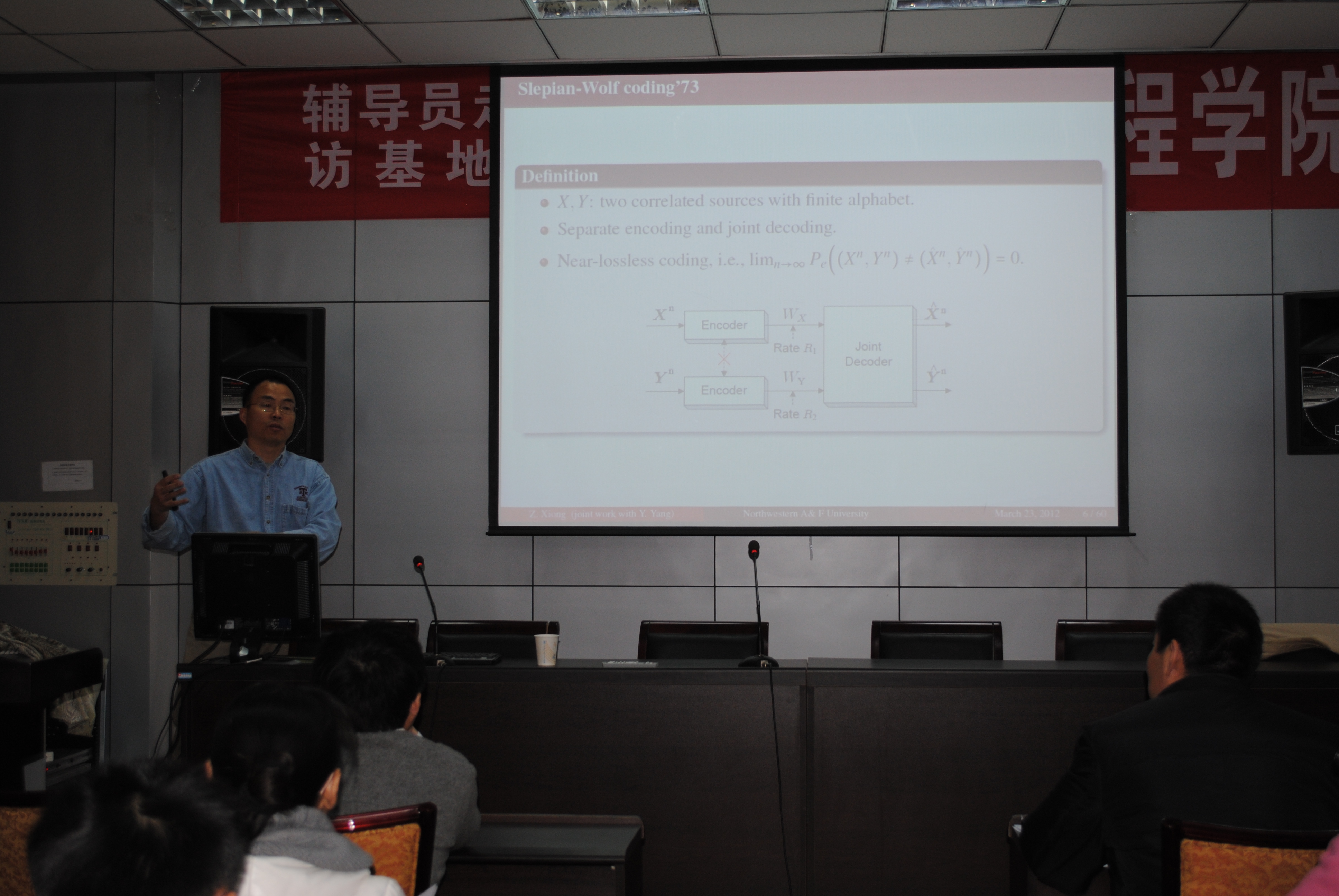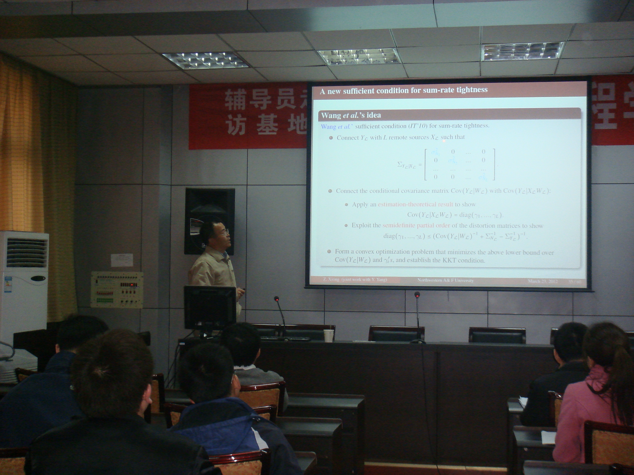 部分教职员工、研究生参加了报告会。熊教授在报告中回顾了信息论中的基本概念和早期成果,然后介绍了其团队在二次高斯多终端信源编码的研究中取得的最新成果,并同与会师生就相关理论方法进行了深入的交流。 熊子祥、美国德州农机大学电子与计算机工程91成人