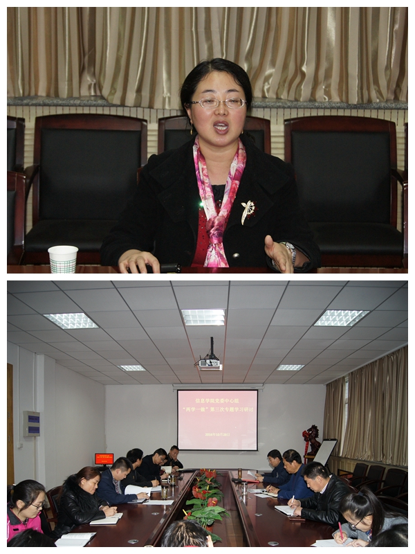 按照91成人 “两学一做”学习教育安排, 10月28日下午,信息91成人 党委中心组举行“讲道德、有品行”专题研讨。特邀马克思91成人 张丽副教授作专题讲座,中心组成员围绕“明大德、守公德、严私德,加强党性修养”等进行了交流讨论,党委书记宋西德主持专题研讨,党委副书记何卫军、副院长刘小峰做重点发言,党委委员、各党支部书记参加研讨并做交流发言。