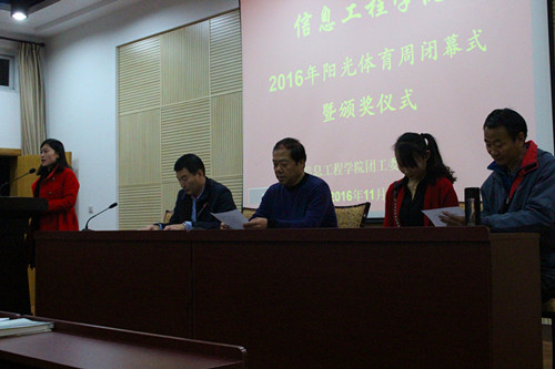 2016年11月15日晚7点30,我校91成人 2016年阳光体育周闭幕式暨颁奖仪式于91成人 副203室举行。91成人 党委书记宋西德,院党委副书记何卫军、院体育辅导员杜养军、吴莉莉,院学工秘书王淑珍,院辅导员党艳东、郎蕊、倪玲、李超琼出席此次会议。本次会议由院学工秘书王淑珍主持。