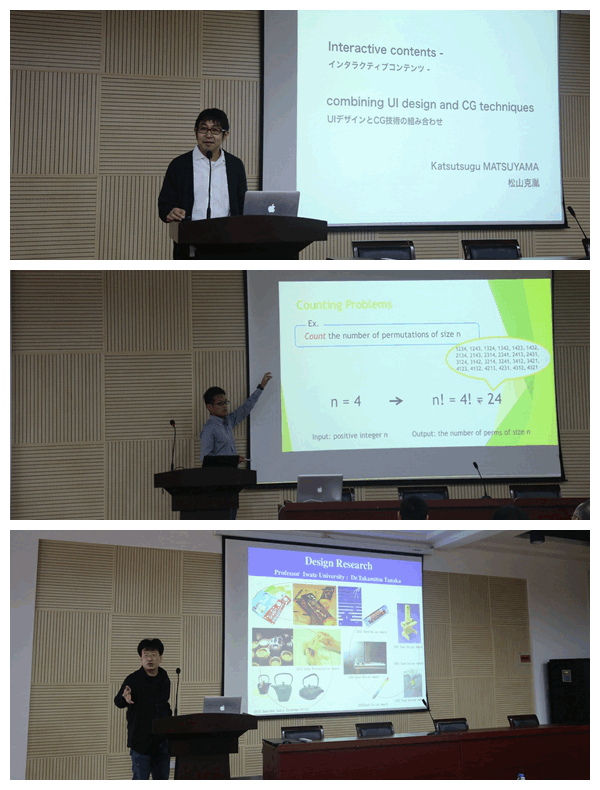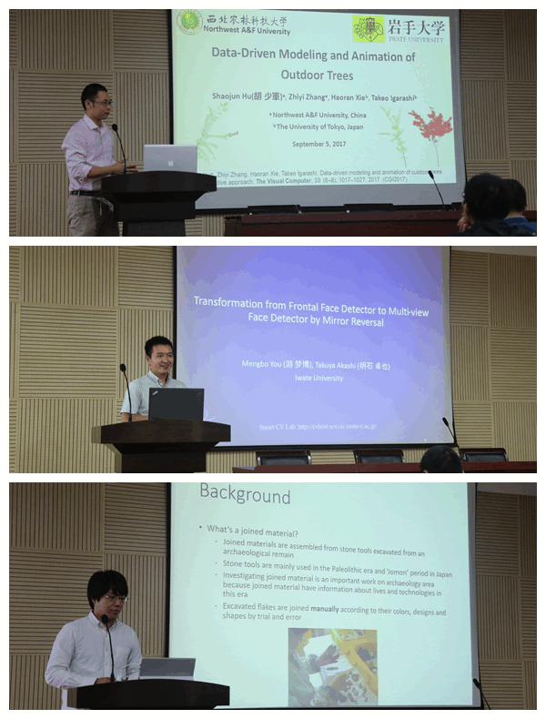 此次学术交流以“三维测量技术的合作研究研讨”为主题,开展了系列学术报告。今野教授为师生作了题为“Interactive Visualization of Assembly Instruction for Stone Tools Restoration”的学术报告。该报告详细介绍了一种将三维装配爆炸图应用到考古学研究的新方法,即采用基于点云的交互式可视化技术实现了石器工具的快速修复。田中隆充教授、川崎秀二教授、木村彰男教授、Enhkbayar教授分别作了“通过榫卯技术进行立方体拼图的创意开发”、“通过数据分析研究建立臭菘的恒温维持机制模型”、“混合方法的3D复杂雕像模型重建”、“脸部度量及其应用”的学术报告。同时,91成人 胡少军副教授、杨龙博士、王泽鹏博士与岩手大学青年教师松山助教、山中助教、卢忻助教分别进行了学术报告。报告的题目分别是:“Data-Driven Modeling and Animation of Outdoor Trees”、“Handheld 3D scanning with commodity depth cameras”、“Surface Unfoldment and 2D Feature Lines Extraction of Heritages based on 3D point clouds”、Interactive contents - combining UI design and CG techniques (互动内容 - 结合UI设计和CG技术)、Algorithms for Enumerating Discrete Objects(枚举离散对象的算法)、Face Parts Measurement and Its Application(脸部度量及其应用)。两校研究生也汇报了近期的研究成果,受到双方教授的积极评价。