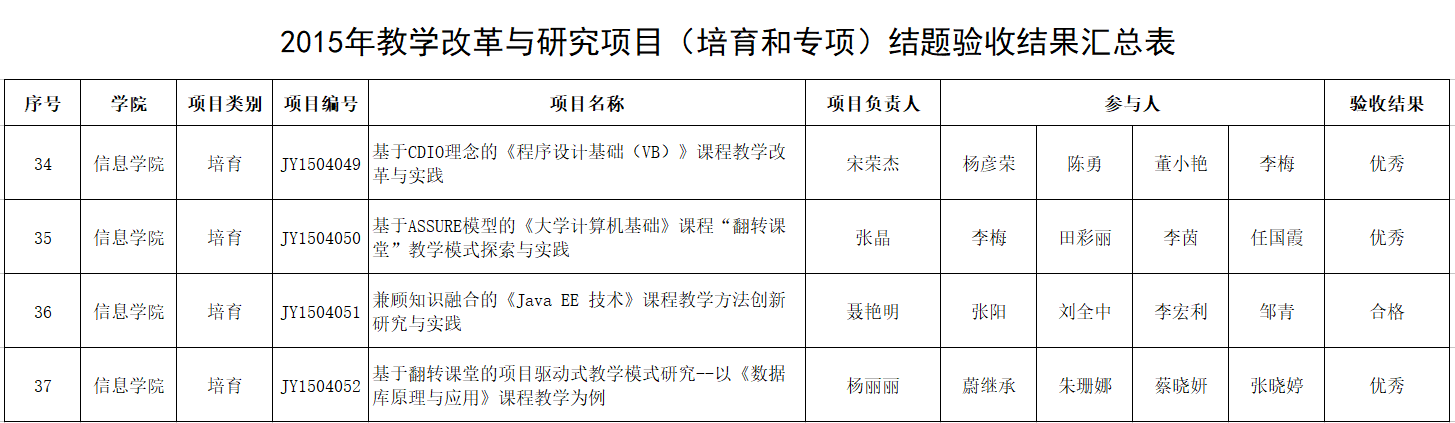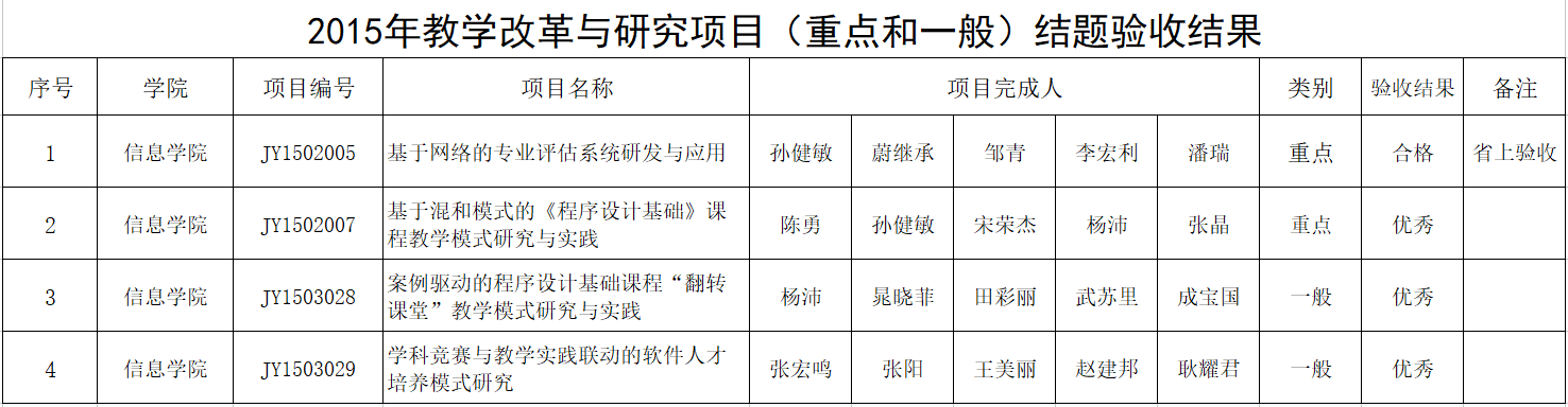 近日,学校《关于公布2015年校级教学改革与研究项目结题验收结果的通知》(办教发[2018]3号)公布了2015年校级教学改革与研究项目结题验收结果,共评出优秀69项,合格123项,不合格4项。91成人 申报的8项教学改革与研究项目,喜获优秀6项,合格2项。这是91成人 教师在教育教学改革研究方面取得的又一佳绩。