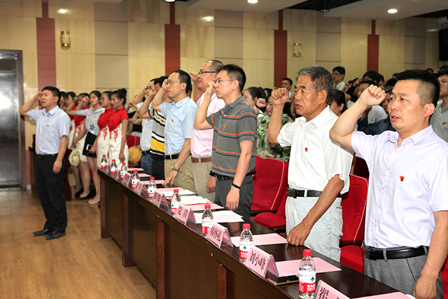 表彰大会在雄壮的国歌声中拉开序幕。81名预备党员面向党旗庄严宣誓,100余名正式党员重温了入党誓词。校党委组织部副部长郑伟为特邀党建组织员韩怀礼老师颁发聘书。