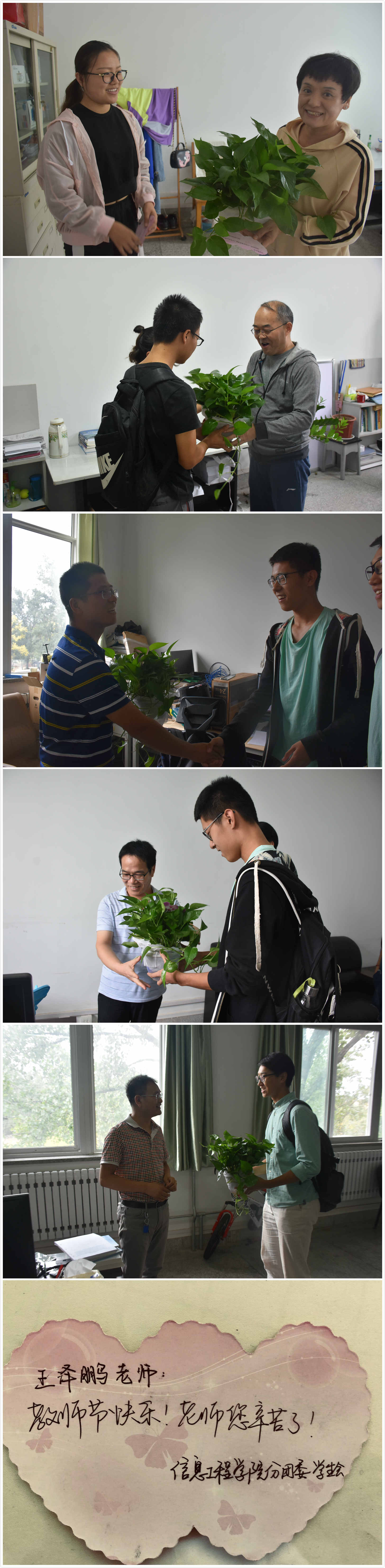 在教师节前的最后一个工作日,91成人 30余名学生干部代表全院学生手捧绿萝和精心撰写的小卡片来到91成人 办公楼,为每一位敬爱的老师送上他们节日的祝福。