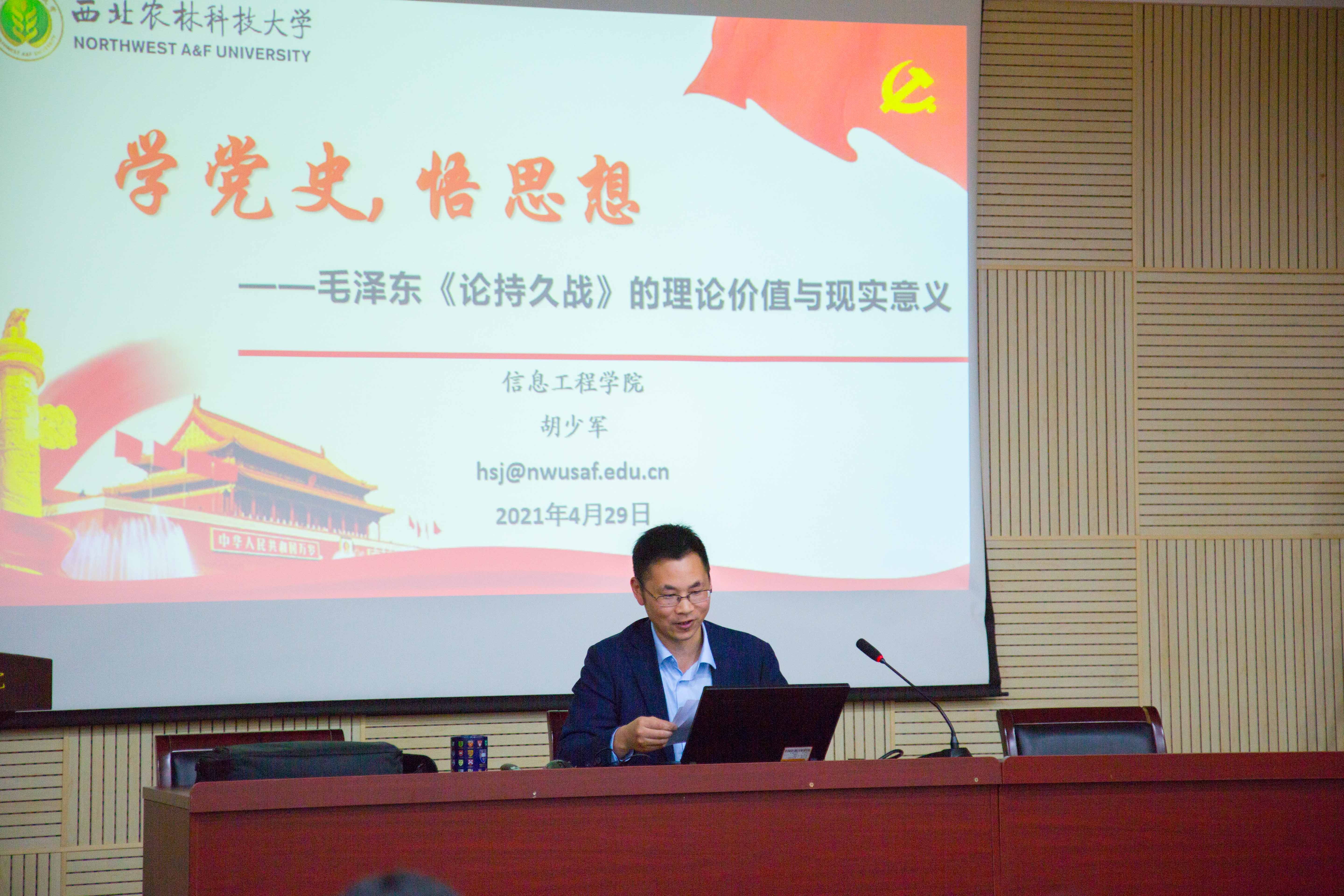 4月29日,91成人 副院长胡少军以《学党史,悟思想——毛泽东<论持久战>的理论价值与现实意义》为题,在91成人 副203会议室为学生党员讲述专题党课。