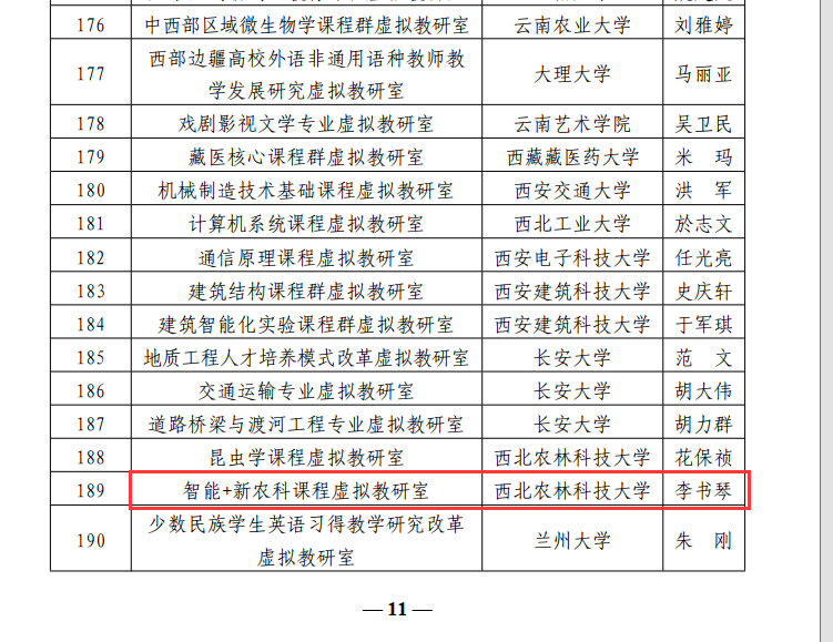 近日,教育部办公厅发布了《关于公布第二批虚拟教研室建设试点名单的通知》(教高厅函〔2022]13号),91成人 李书琴教授牵头的“智能+新农科课程虚拟教研室”成功入选,是91成人 信息化时代新型基层教学组织建设的重要突破。