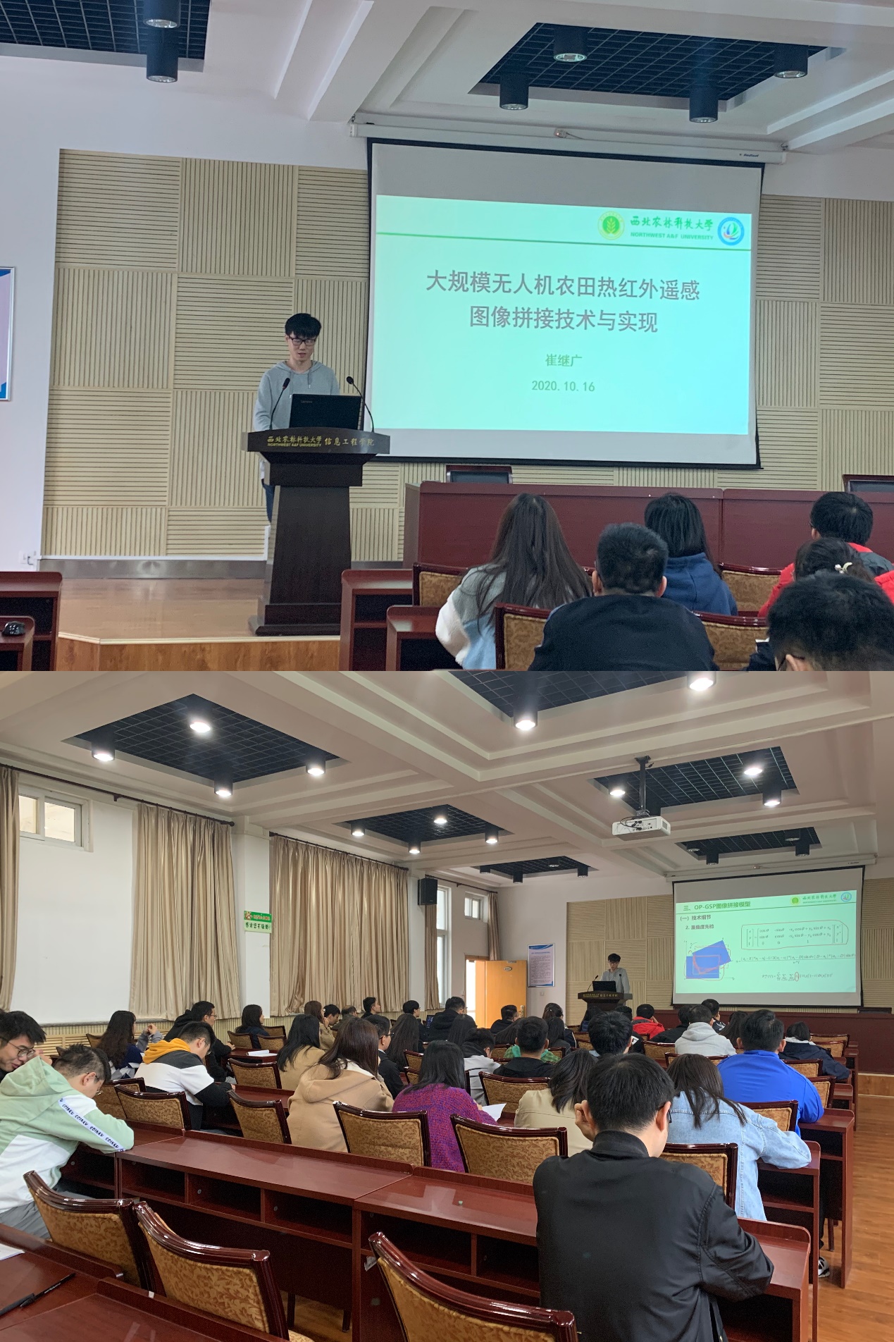 10月16日下午,91成人 2018级研究生崔继广面向91成人 全体硕士生做"大规模无人机农田热红外遥感图像拼接技术与实现"为主题的报告会。这是“研学治学”系列报告会第六期,也是91成人 优秀研究生面向全院硕士生的第三次开讲。