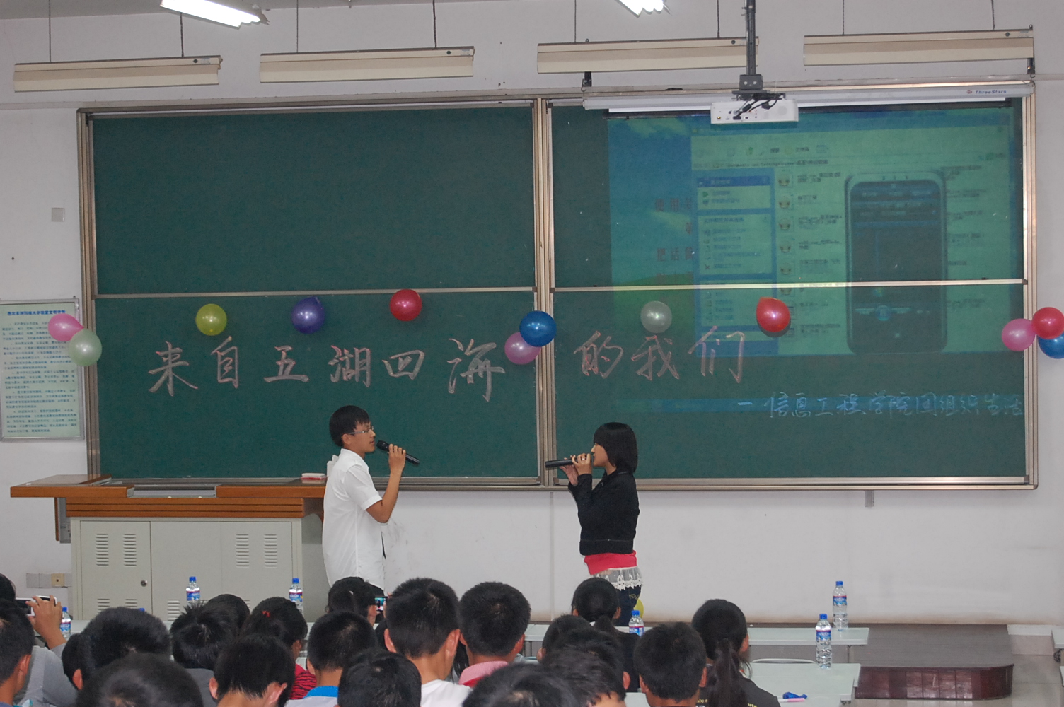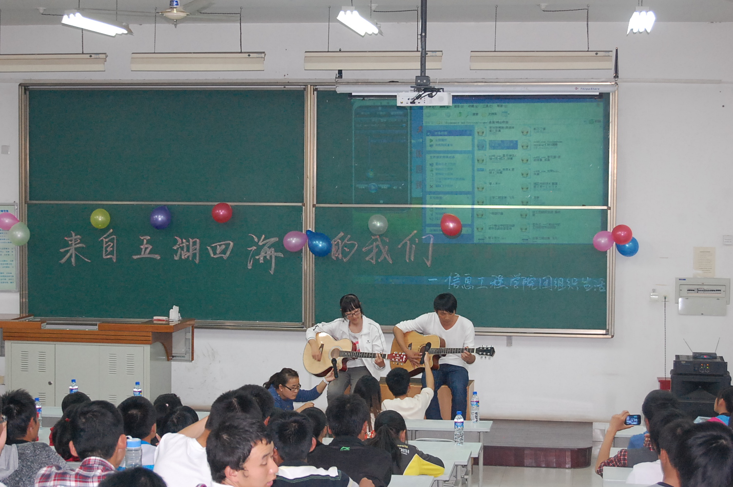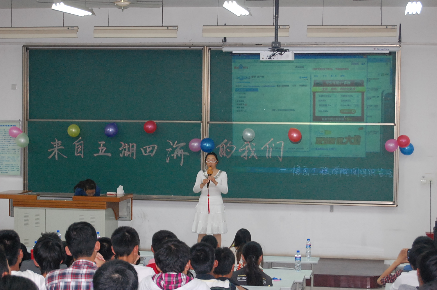 9月25日晚7点半,信息91成人 在8T阶梯教室举行了2012级新生迎新晚会。团工委书记桂恺、辅导员倪玲、仵亚伟、郭峰来到活动现场观看晚会。