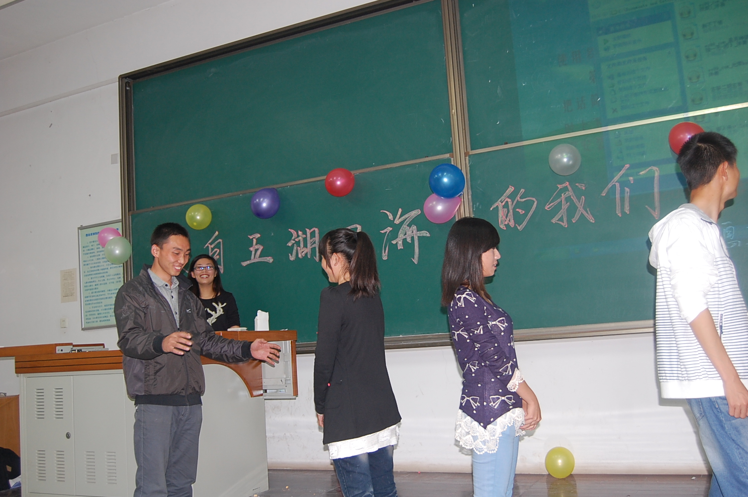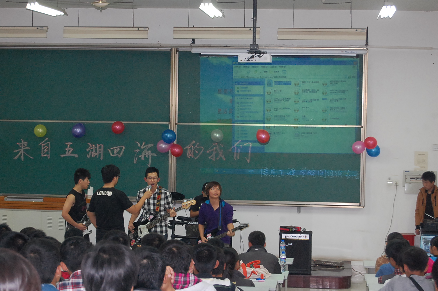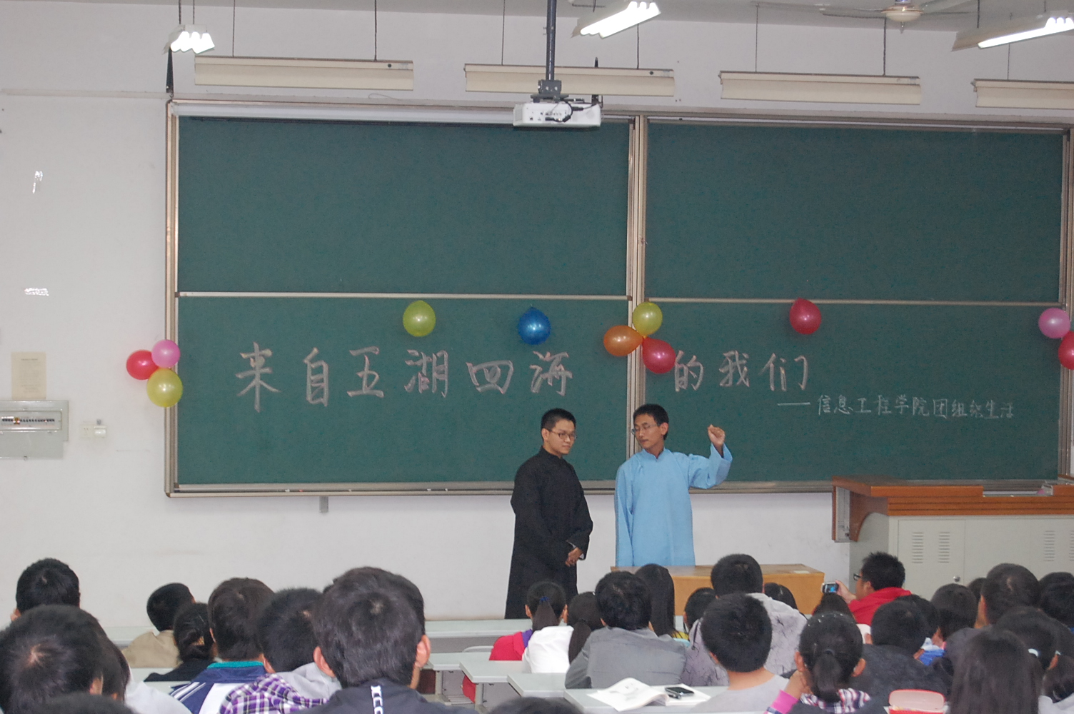 9月25日晚7点半,信息91成人 在8T阶梯教室举行了2012级新生迎新晚会。团工委书记桂恺、辅导员倪玲、仵亚伟、郭峰来到活动现场观看晚会。
