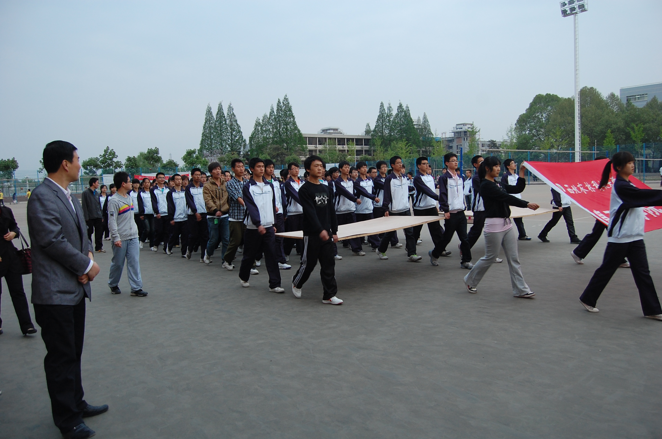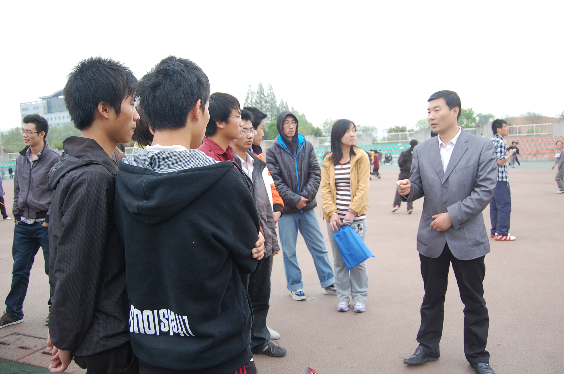 2012年4月17日下午6点,91成人 党委副书记何卫军、学工秘书王淑珍及辅导员倪玲、桂恺慰问91成人 田径运动员和方阵队员。