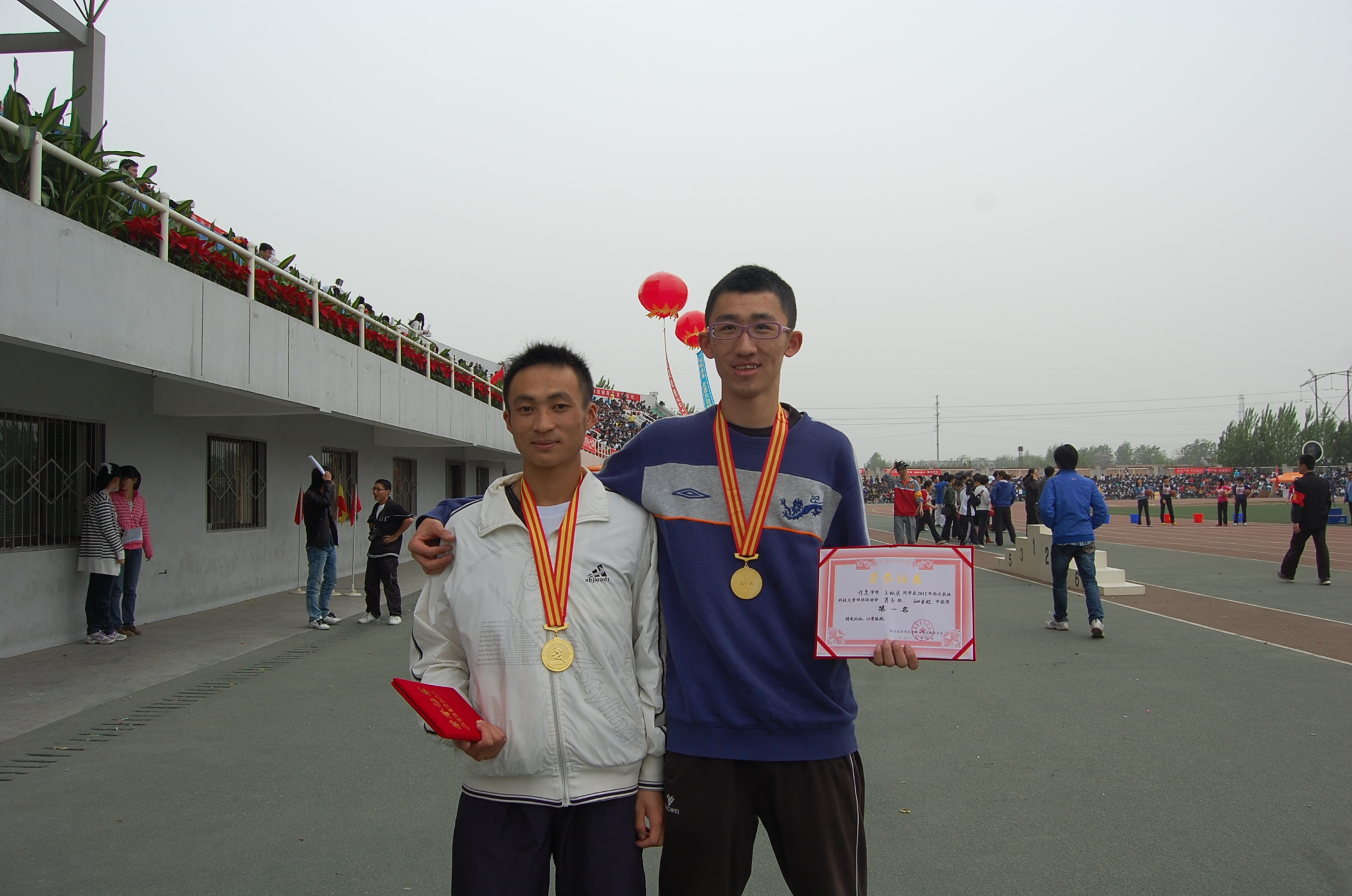 19日上午,91成人 何李军同学在男子800m预赛中,表现出了十足的信心,以预赛第一名的成绩轻松晋级决赛。下午三时左右,何李军同学再次出征,枪声一响,何李军同学如离弦的箭一样奔向终点,两圈过后,何李军同学以明显优势成功问鼎男子800m比赛。赛后校宣传部副部长闫德忠和校党工委副书记赵阿兰为何李军同学颁发金牌和奖状并合影留念。