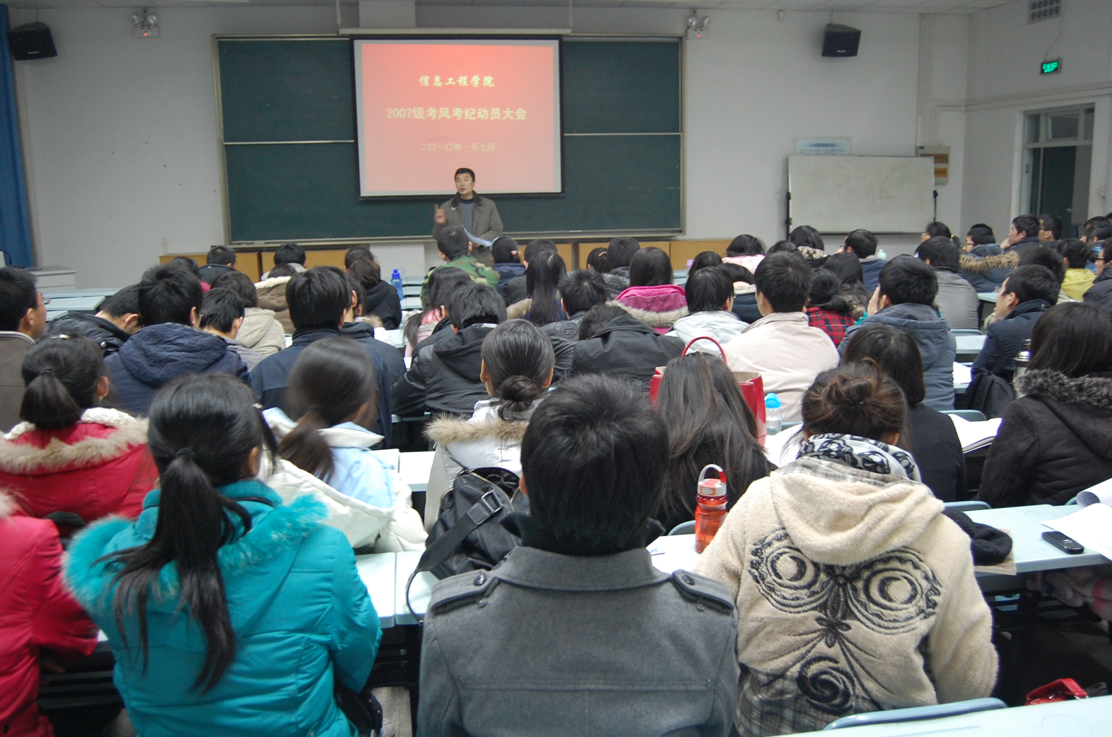 为落实学校加强考风考纪工作会议精神,进一步强化91成人 学生诚信意识,严肃学生考试纪律,杜绝学生考试违纪、作弊现象,根据91成人 加强考风考纪工作会议安排,1月7日下午和晚上,91成人 分别对2007级和2009级学生分年级召开了加强考风考纪动员大会。91成人 党委书记樊世明和党委副书记何卫军分别就诚信考试做了动员讲话和具体安排。全体辅导员和部分班主任参加了动员大会。