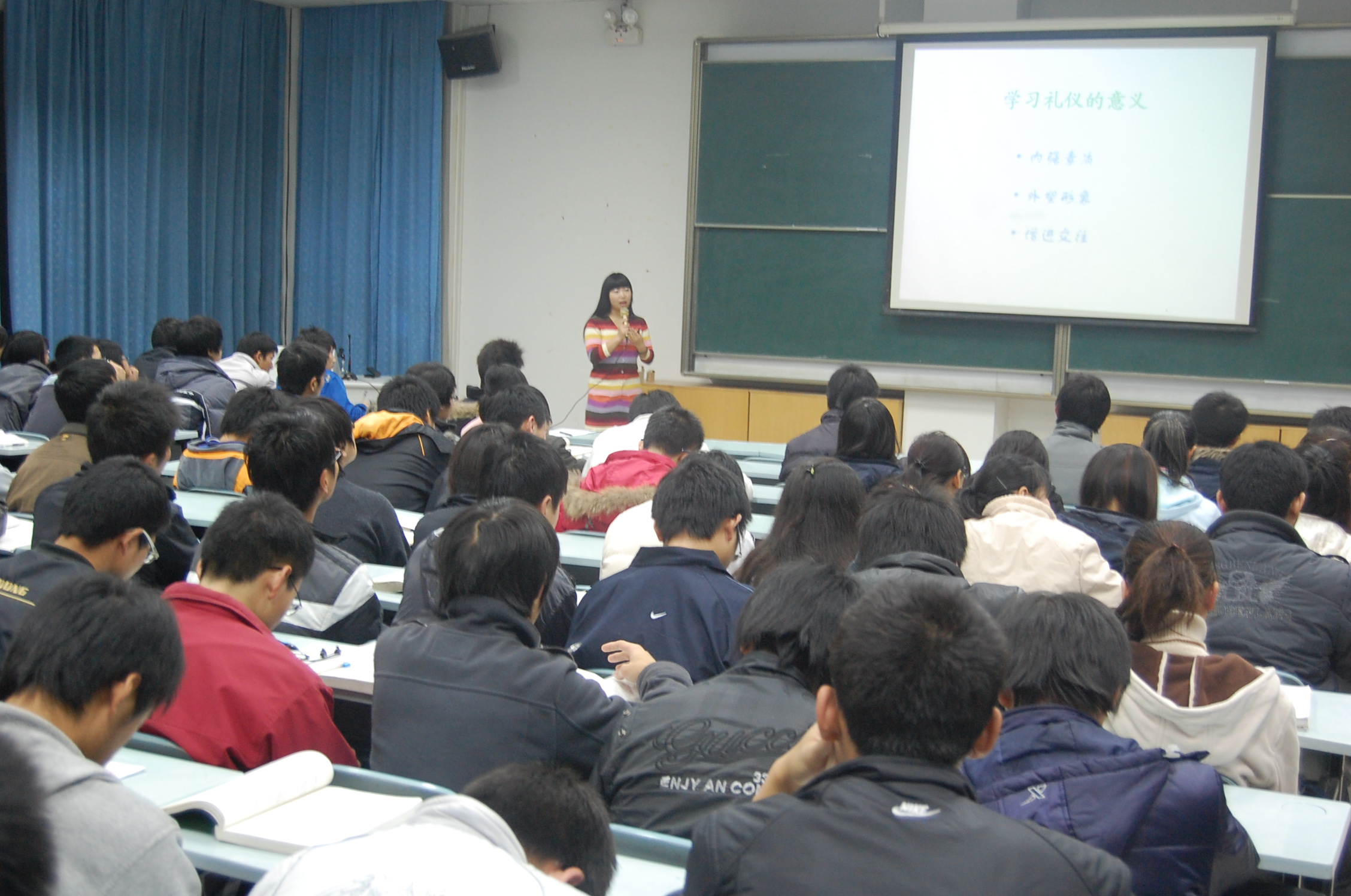 王老师首先向同学们介绍了学习礼仪的重要意义,引起同学们对自身礼仪的重视。然后分别从形象礼仪、举止礼仪、谈话礼仪、交往礼仪等多方面,详细地告诉同学们在细节上应当注意的问题。她强调无论是在平时还是在商务中,都应注重礼仪,时刻保持自己的良好形象,这样才能为赢得赏识埋下伏笔,为未来的成功垫下基石。最后,王老师和同学们分享自己的生活经历,共讨成功礼仪细节,希望同学们能从中发现并学习其中的闪光点。王老师送给在场同学自己在工作中的心得体会:“只要你用心来做,没有什么做不成”。同学们听后深有感触。