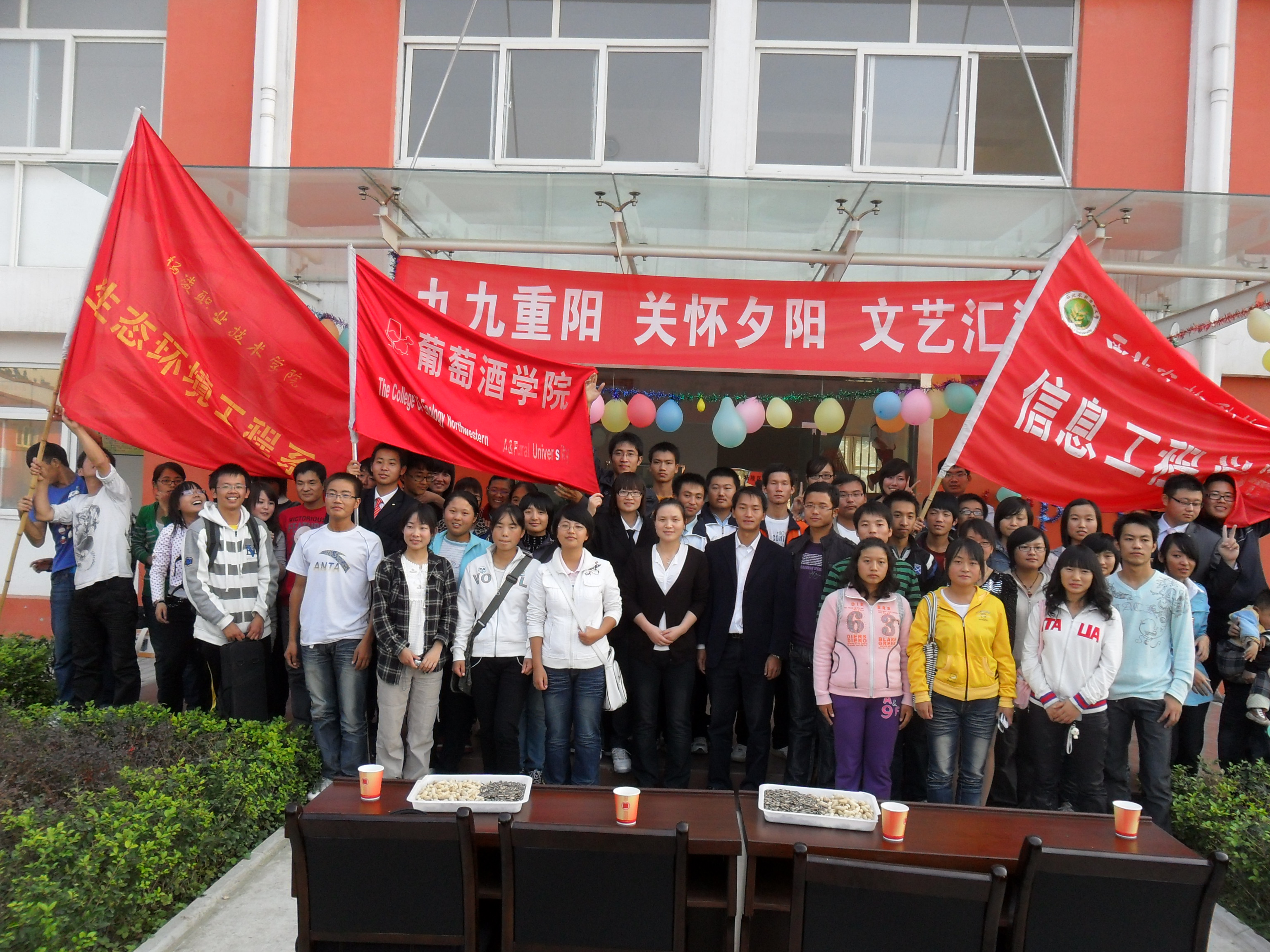 的学生举着院旗,带着节目,来到杨陵区社会福利院和中心敬老院,为这里的老人带来最诚挚的问候和最真诚的慰问。同学们在敬老院里悬挂起了横幅彩带,气球等装饰物,福利院的小院显得格外热闹。下午2:30分许,演出正式拉开序幕。同学们在台上为老人带了魔术、阮乐、小品、舞蹈、丑角戏等多种形式的表演,赢得了老人的阵阵掌声,杨陵区电视台,杨陵区农业科技报记者对活动进行了采访,在演出结束之后同学们送上了给孩子们买的玩具和给老人们买的手链,在一片夕阳余晖之中,同学们踏上归途,圆满完成了这次文艺汇演。