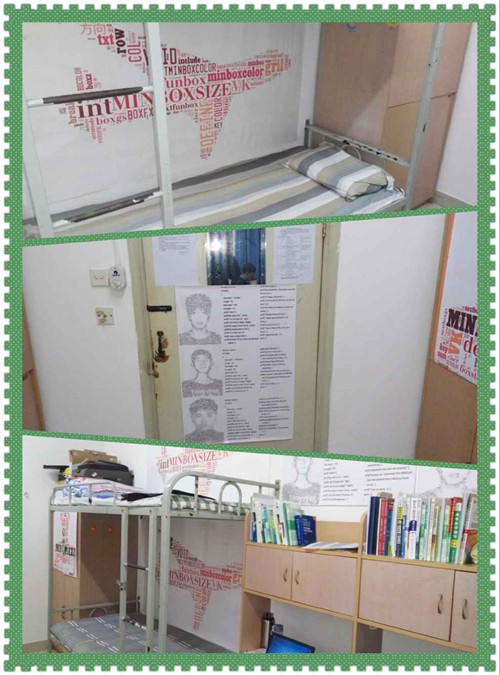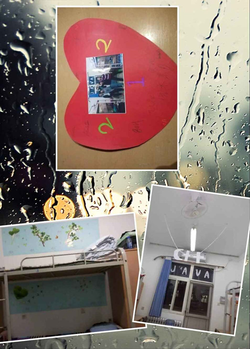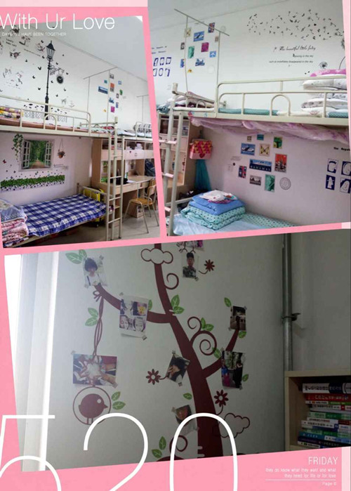 走近430,自然气息迎面而来,缤纷的花树装点着原本枯燥的木门,每个人的床边都精心布置了各具特色的图画,窗台上摆放着盆栽,每天都有潋滟的风景。还有我们的照片墙,美丽精致的图案组成了我们的故事。再看我们的心意——门旁的盒子,是我们的宿舍基金盒,负责收集废品回收的钱和我们的舍费,为让我们的宿舍更美丽尽一份力。
