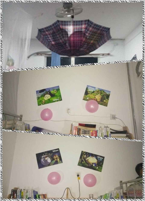 我们宿舍四人来自祖国大江南北,汇聚在此百里秦川,渴望和睦相处,让四年的大学生活流淌在温暖中。因此我们宿舍的主题为温暖与童真,在墙上张贴象征美好的龙猫海报。此外,宿舍的最大创意在挂着的雨伞。当疾风起时,缤纷的气球从伞中飘落,形成一种动态的温馨。
