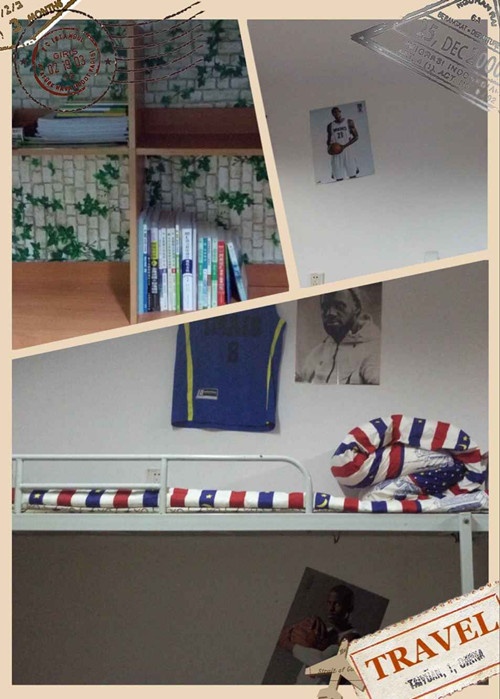 我们宿舍本着体现91成人 特色,发扬91成人 文化精神的原则,门后的海报采用以C语言为模板的自我介绍,配以乱码生成的免冠照,床旁的墙上以一段程序的内容生成的字符云为装饰,象征我们在C语言的指引下翱翔于信息天空。