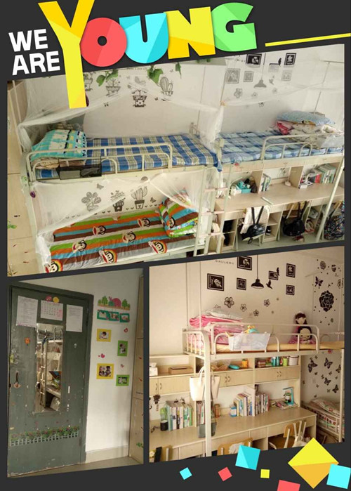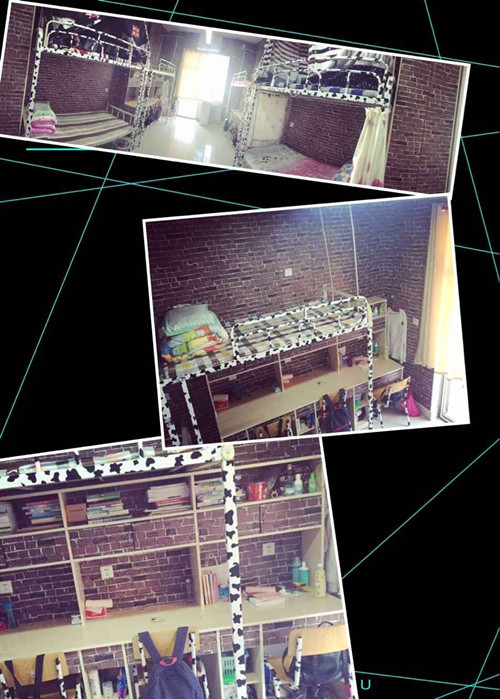 走进212宿舍,你会为其创意感到新颖。212宿舍干净爽朗,宿舍里的人热情大方,212宿舍给人一种家的感觉。宿舍的墙上贴着四张蓝色的壁纸,壁纸被修饰以叶子、花朵和蝴蝶,清新自然。两边的书桌上面分别贴着“爱信息”和“爱生活”的字样,每个字都是由宿舍人用剪刀剪出来的,窗户上有“Java"的字样,天花板上吊着用剪纸做成的“C++”,突出了宿舍人对计算机科学与技术的专业的热爱,宿舍人的合照更体现出宿舍人之间的友情是缘分让我们四个人相聚,让我们组成一个“家”。