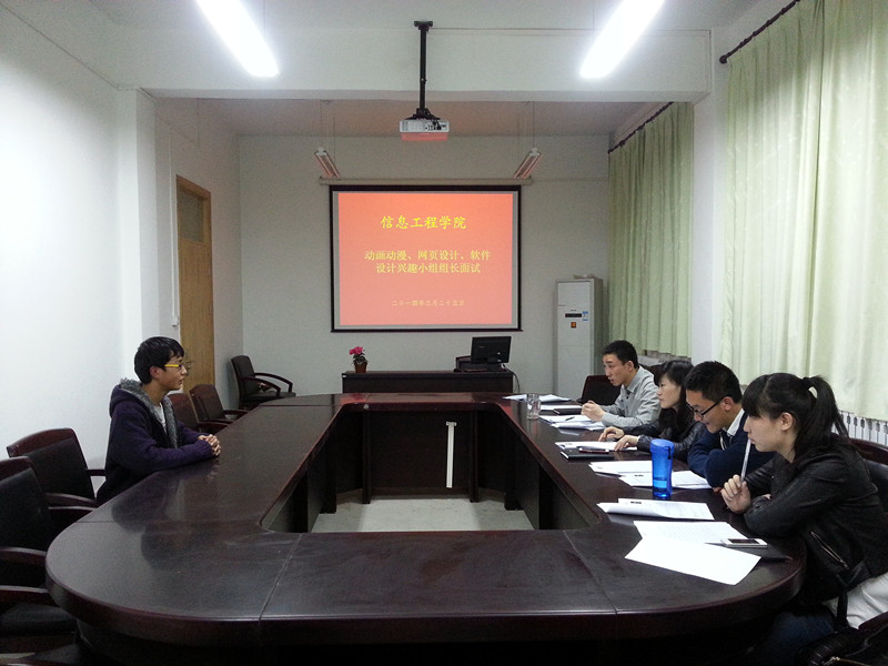 2014年3月25日晚,在91成人 行政楼301进行了动漫设计、网页设计、软件设计三个兴趣小组组长竞选面试。91成人 学工秘书王淑珍、91成人 团工委书记仵亚伟、91成人 13级辅导员党艳东、91成人 团工委学生会主席秦亚恒、副主席宝音以及信息技术部部长张向阳对曾德军等10名竞选者进行了面试。