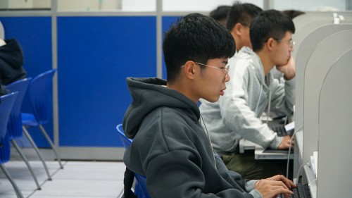 比赛过程中,ACM队队员在一行行埋头于计算机的同学中四处查看着,遇到在一些非技术性问题上求助的同学,也弯下身子尽力帮忙。参赛的同学们更是聚精会神,手指在键盘上飞快地跳动着,眼睛在屏幕与翻开的书本间切换。屏幕上的红绿蓝黑彼此间隔,有着其独特的美妙,完成一道题后,不由得伸个懒腰,然后继续下一道题目,此场景不禁让人想起“无哗战士衔枚勇,下笔春蚕食叶声”的名句。
