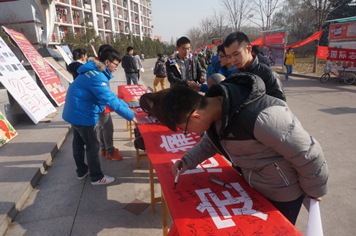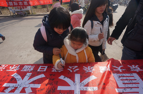 活动期间同学们在横幅上签上自己的名字并且留下内心深处诚挚的感言,“缅怀先烈,勿忘国耻”、“铭记国耻,强我中华”、“牢记历史,不忘屈辱”等等。志愿者们在活动现场分发大量宣传单,让更多的同学了解那段不可遗忘的历史。即使时间渐渐流逝,但是历史不会因时代变迁而改变,事实也不会因翘舌抵赖而消失。活动中,有一位刚上小学的小朋友在横幅上认真的写下了自己的名字,更有同学说道中华儿女不会忘记历史留给我们血的教训。