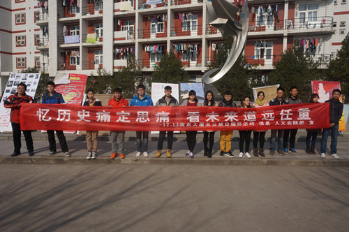 2014.12.13,首次南京大屠杀遇难同胞公祭日,历史不能忘却1937年的那个冬天。在我校北校区西区西超雕塑处由信息91成人 和人文91成人 联合举办 “12.13南京大屠杀死难者国家公祭日”缅怀活动。